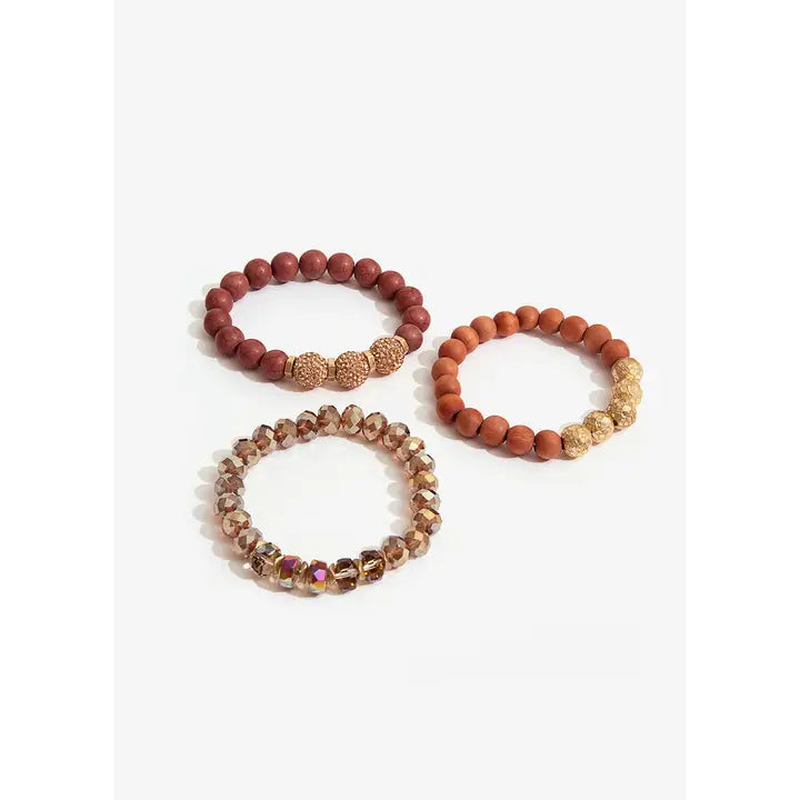 Multipulsera compuesta de tres unidades que combinan las bolas de madera con las de cristal. Tonos dorados, ocres y teja para este complemento con tremenda personalidad. Son elásticas