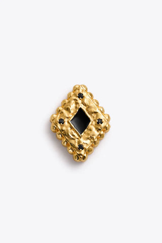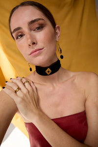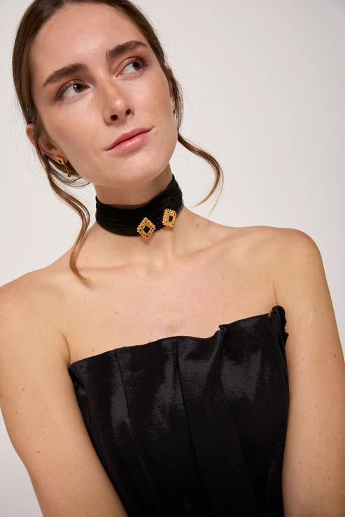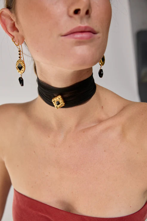 Pieza de latón bañada en oro de 24 kt, cuenta con cuatro circonitas negras y una pieza esmaltada del mismo tono. El broche tiene un efecto martelé.Esta elegante y original pieza está confeccionada con un suave tul en tono negro.La idea de este chokeres que cada uno lo luzca a su estilo, por lo que puedes elegir hasta dos broches.