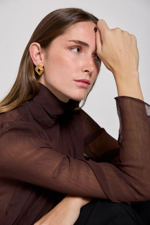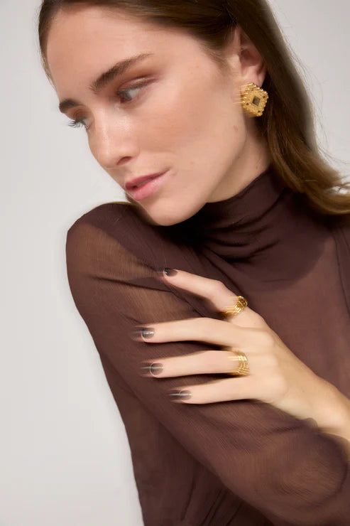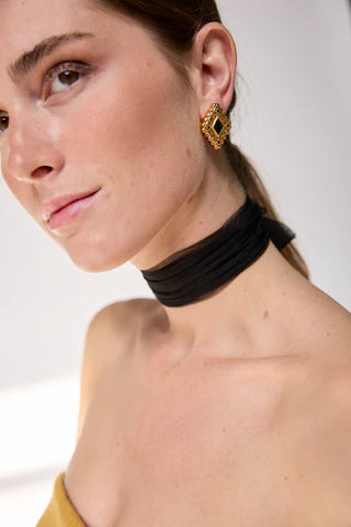 Pieza de latón bañada en oro de 24 kt, cuenta con cuatro circonitas negras en los bordes y un rombo esmaltado a mano. El efecto de la pieza central es martelé. Se aconseja evitar el contacto con perfumes, cremas, jabones y agua. Para conservar el brillo de la pieza te recomendamos limpiarla usando el paño