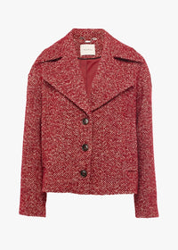 Chaqueta corta de lana con dibujo espiga en tonos rojo y crema. Su silueta cuadrada y tejido suave aportan comodidad y estilo a partes iguales. Perfecta para dar personalidad a looks urbanos o más clásicos. Las solapas amplias, los hombros ligeramente caídos y el cierre de cuatro botones refuerzan su aire entre lo retro y lo contemporáneo.