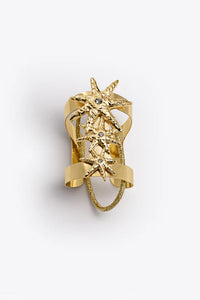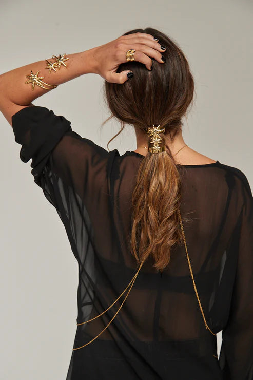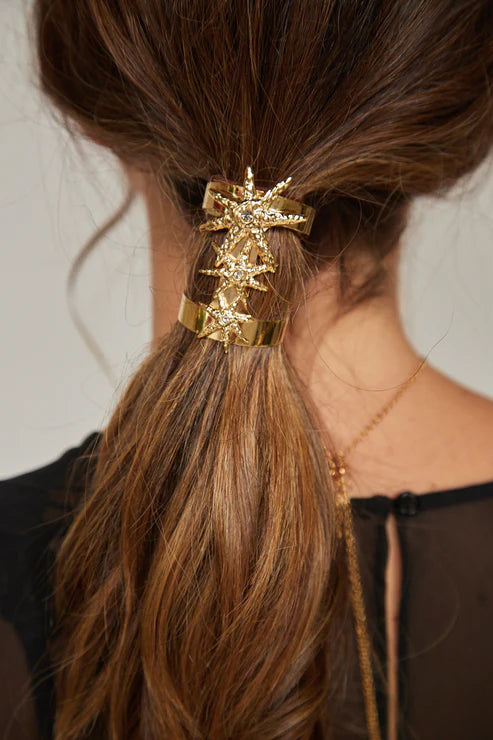 Este accesorio de pelo, estilo joya, es de latón bañado en oro de 24 kt y cuenta con tres estrellas de diferentes tamaños con cristales Black Diamond en color gris, los cuales reflejan la luz de forma sutil, al igual que los diamantes.